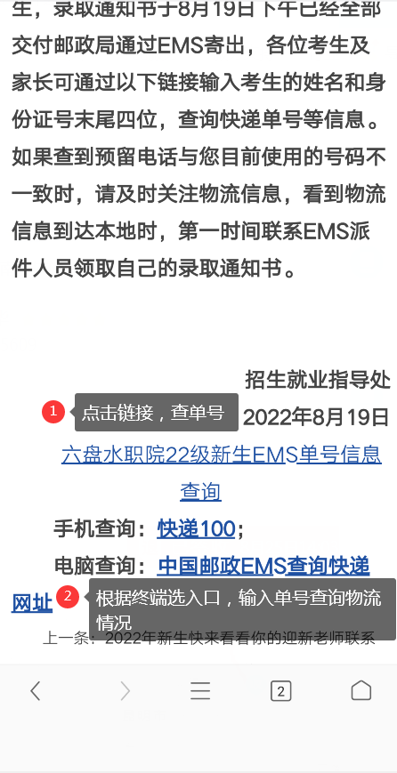 2022年通過高考被我院錄取的貴州考生,錄取通知書于8月19日下午已經全部交付郵政局通過EMS寄出,各位考生及家長可通過以下鍊接輸入考生的姓名和身份證号末尾四位,查詢快遞單号等信息。如果查到預留電話與您目前使用的号碼不一緻時,請及時關注物流信息,看到物流信息到達本地時,第一時間聯系EMS派件人員領取自己的錄取通知書。